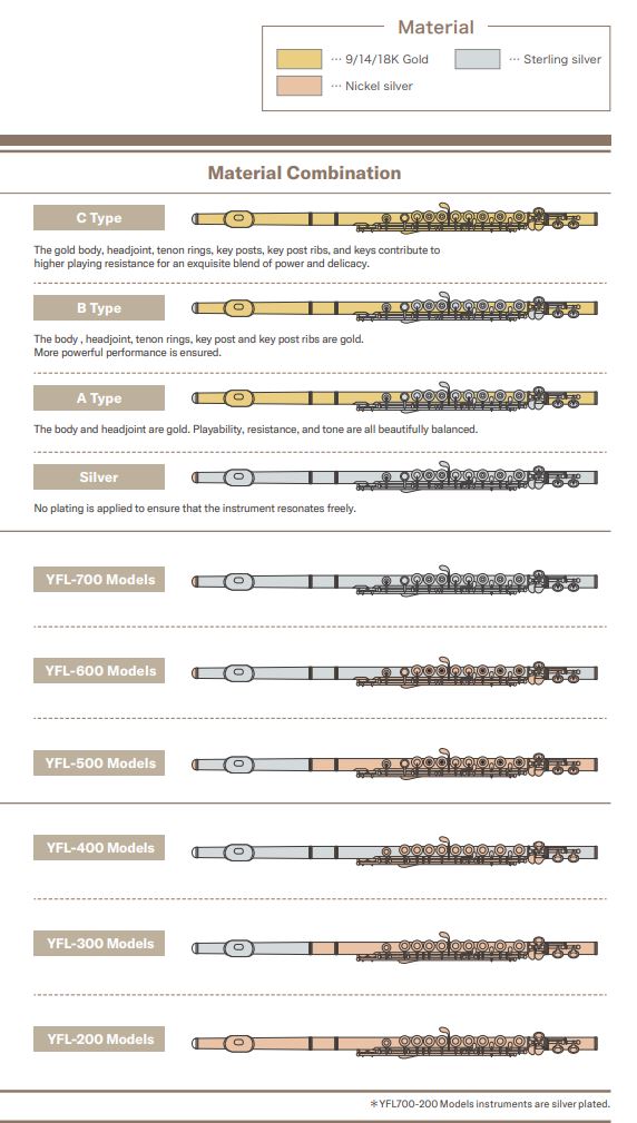 A título de exemplo dos múltiplos acabamentos, tomemos como exemplo os acabamentos das flautas da Yamaha: em ouro (gold), prata (sterling silver) e alpaca (nickel-silver).